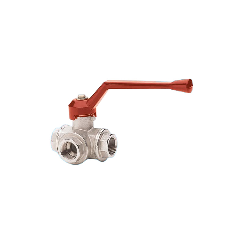 Drieweg kogelkraan met T-boring. Aansluiting 3 x BSP binnendraad. Huis messing verchroomd. Kogel messing hard verchroomd. Kogelafdichting PTFE. Handgreep aluminium rood gelakt.