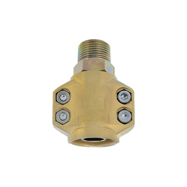 Verzinkt stalen stoomslangkoppeling DIN EN 14 423 met buitendraad. Slangpilaar met borgrand. Kompleet met messing klemschalen.
