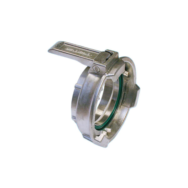 Een RVS aansluitstuk voor een tankwagenkoppeling met binnendraad. Het RVS aansluitstuk bestaat uit de kroonring en een spanring.